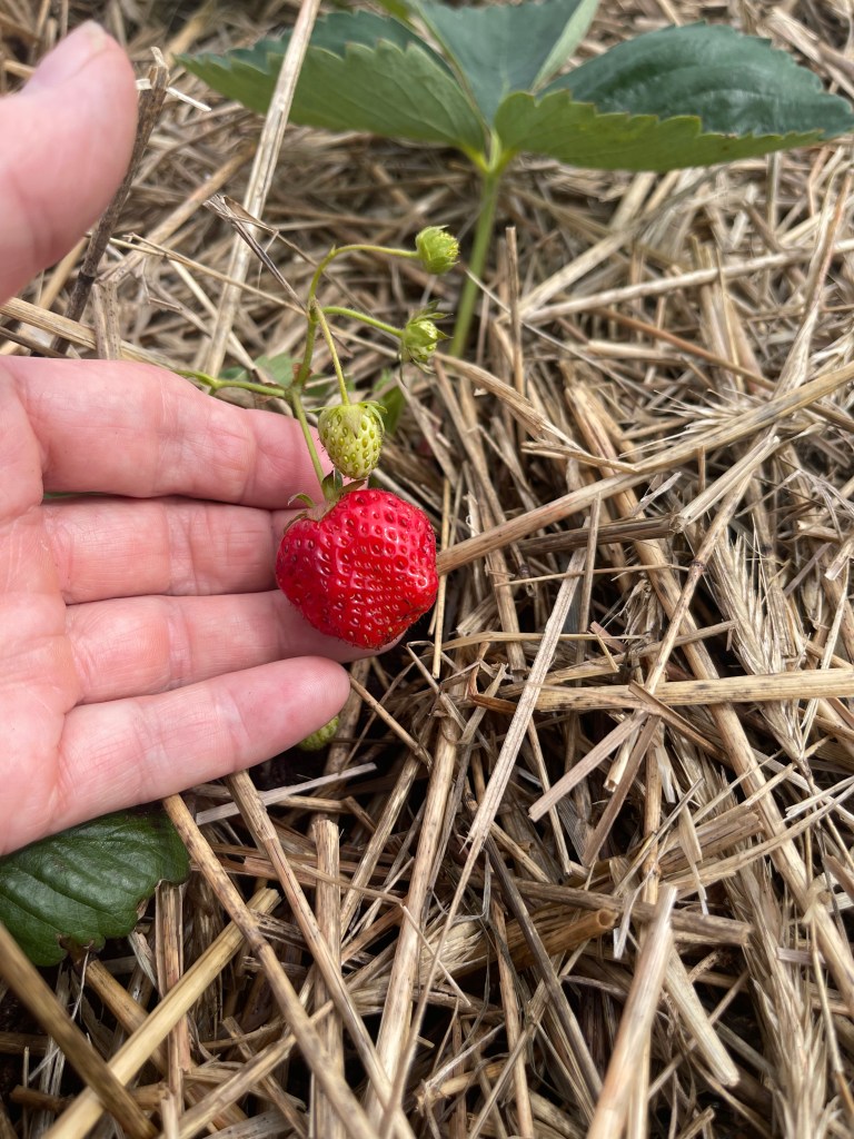 Gärdet rymmer gott och väl både vall till hö, en mindre fruktträdgård, ett tunnelväxthus och täckodlingar för potatis och andra rotfrukter.