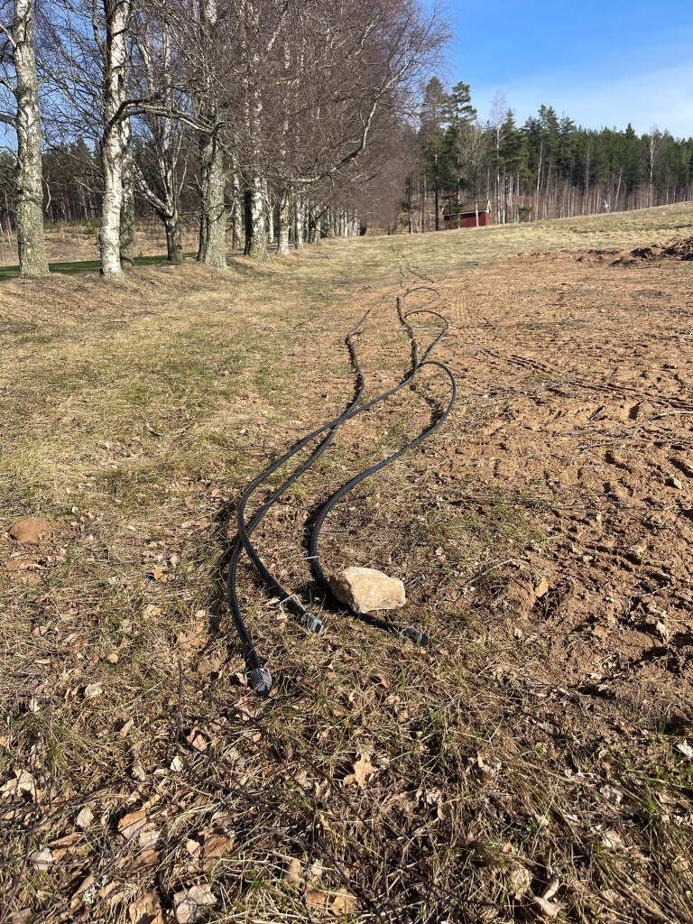Vänster bild visar tre stycken 50 meter långa droppslangar som är utlagda i förväg för att om möjligt bli lite rakare. Det var kallt och de var stela, så det gick väl sådär.