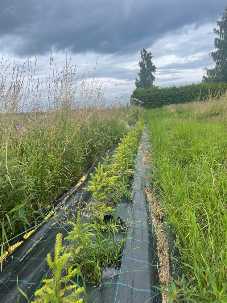 Genom att lägga både droppslang och markduk tar jag höjd för att första somrarna kan bli torra och att granplantorna har mycket gräs och annan vegetation att slåss emot.