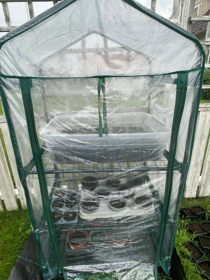 Tomaterna jag hade inne i vintras fick en abrupt start i och med den kalla starten på säsongen och har nog inte trivts i kyla och blåst. Därför har jag satsat på små enkla växthus (en ställning med plast och dragkedja över) från Biltema. Här kommer jag nästa säsong att ställa ut innetomaterna när det är dags.