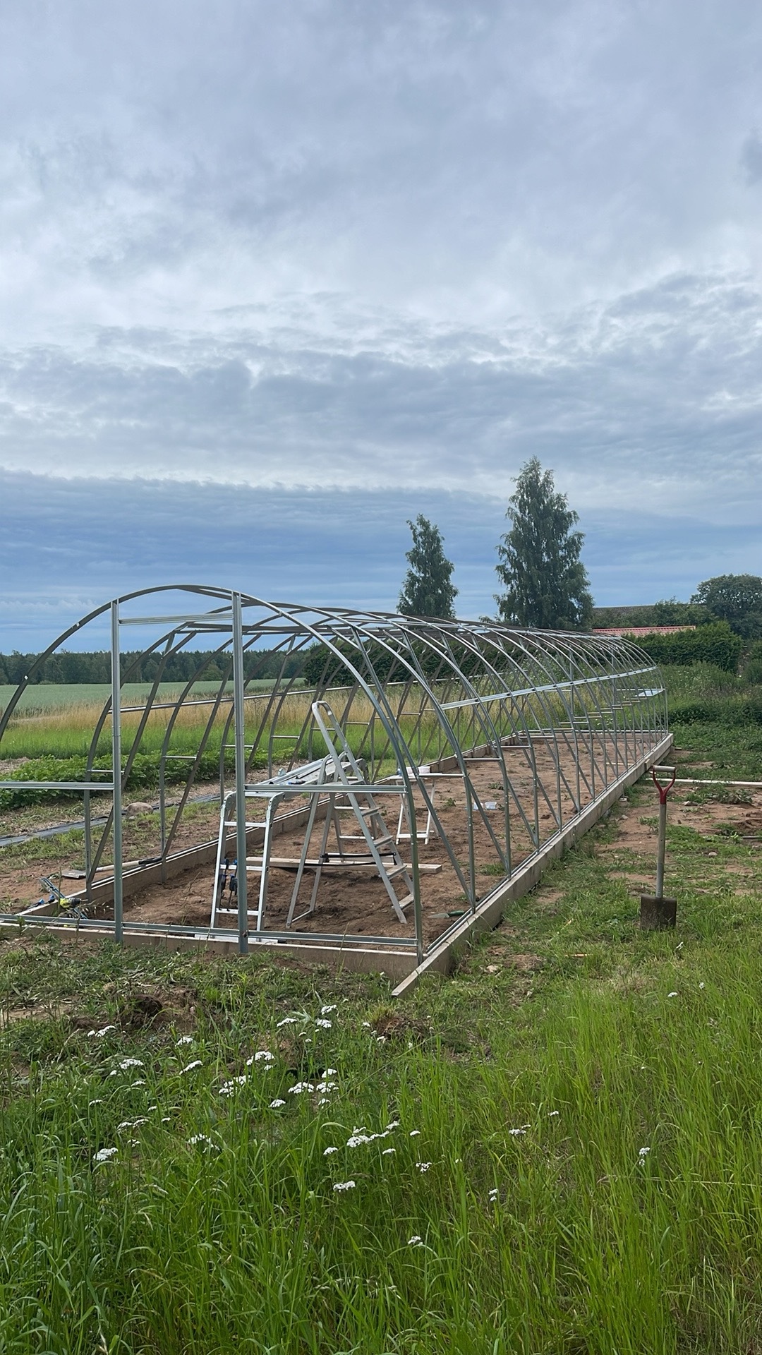 Vi har i skrivande stund fått upp alla bågarna och kommer nu närmaste tiden att jämna marken inne i tunneln, bygga odlingslådorna och lägga markduk.