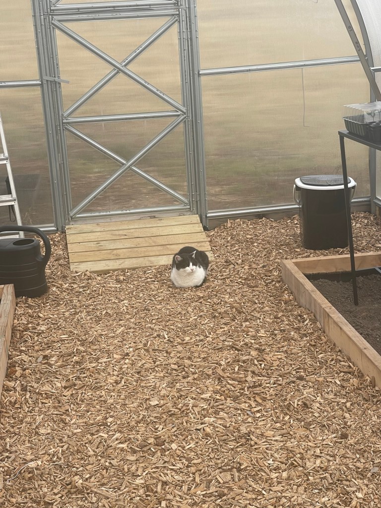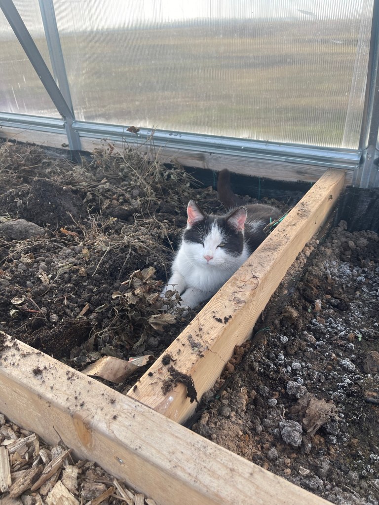 Några som uppskattar växthuset är grannens katter som gillar att vila på flisen. Det finns också mycket spännande som rör sig i jorden och som behöver jagas och styras upp…