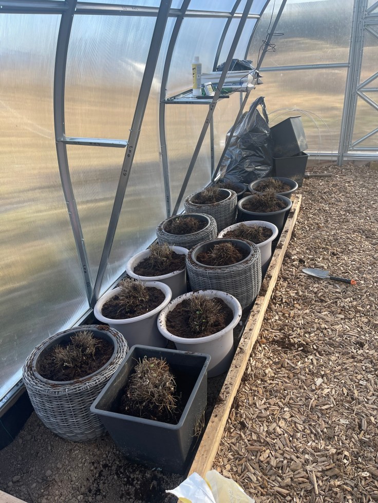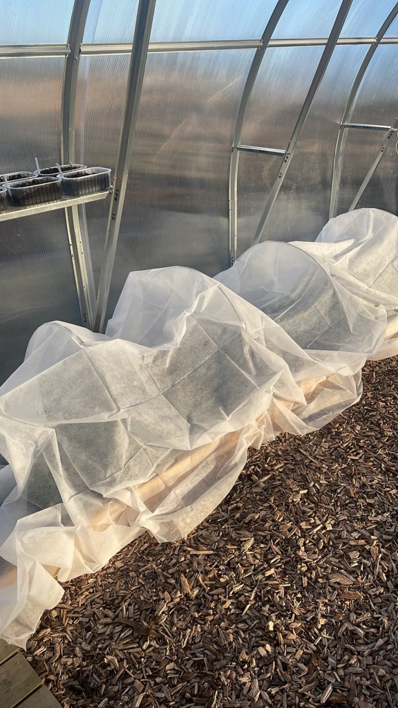 Helgen var varm och med solens hjälp blev det som varmast 32 grader inne i växthuset. Kommande veckor ska dock bjuda på ner mot minus fem på nätterna och måttliga två plusgrader dagtid. Därför får plantorna bo i en extra liten tunnel så här i början.